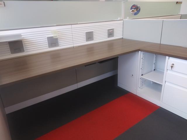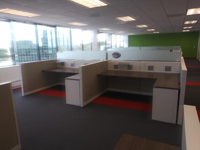 GORGEOUS STEELCASE ANSWER WORKSTATIONS. EACH WORKSTATION HAS: A 7'X30" MAIN WORKSURFACE, 118X30 RETURN WORKSURFACE, 1PPB PED, 1 UNDER COUNTER BOOKSHELF, 1 UNDER COUNTER STORAGE CABINET, GLASS DIVIDING PANEL, BELTLINE INBOARD POWER AND DATA. PANELS ARE 42" TALL WITH 12" GLASS STACKER ON THE SPLINE. WORKSTATIONS ARE SOLD IN PODS OF 4 AND HAVE VERY LIMITED RECONFIGURABLITY.